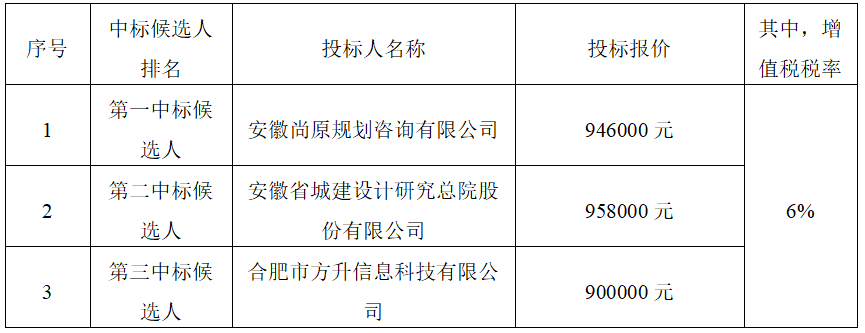 經(jīng)評(píng)審,招標(biāo)人確定安徽尚原規(guī)劃咨詢有限公司為中標(biāo)人,中標(biāo)價(jià)為人民幣(大寫)玖拾肆萬陸仟元整,(小寫)946000元(其中,增值稅稅率6%),服務(wù)期限:自合同簽訂之日起1年,按合同約定完成本項(xiàng)目全部工作。