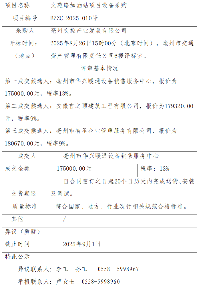 文苑路加油站項(xiàng)目設(shè)備采購(gòu)成交結(jié)果公示