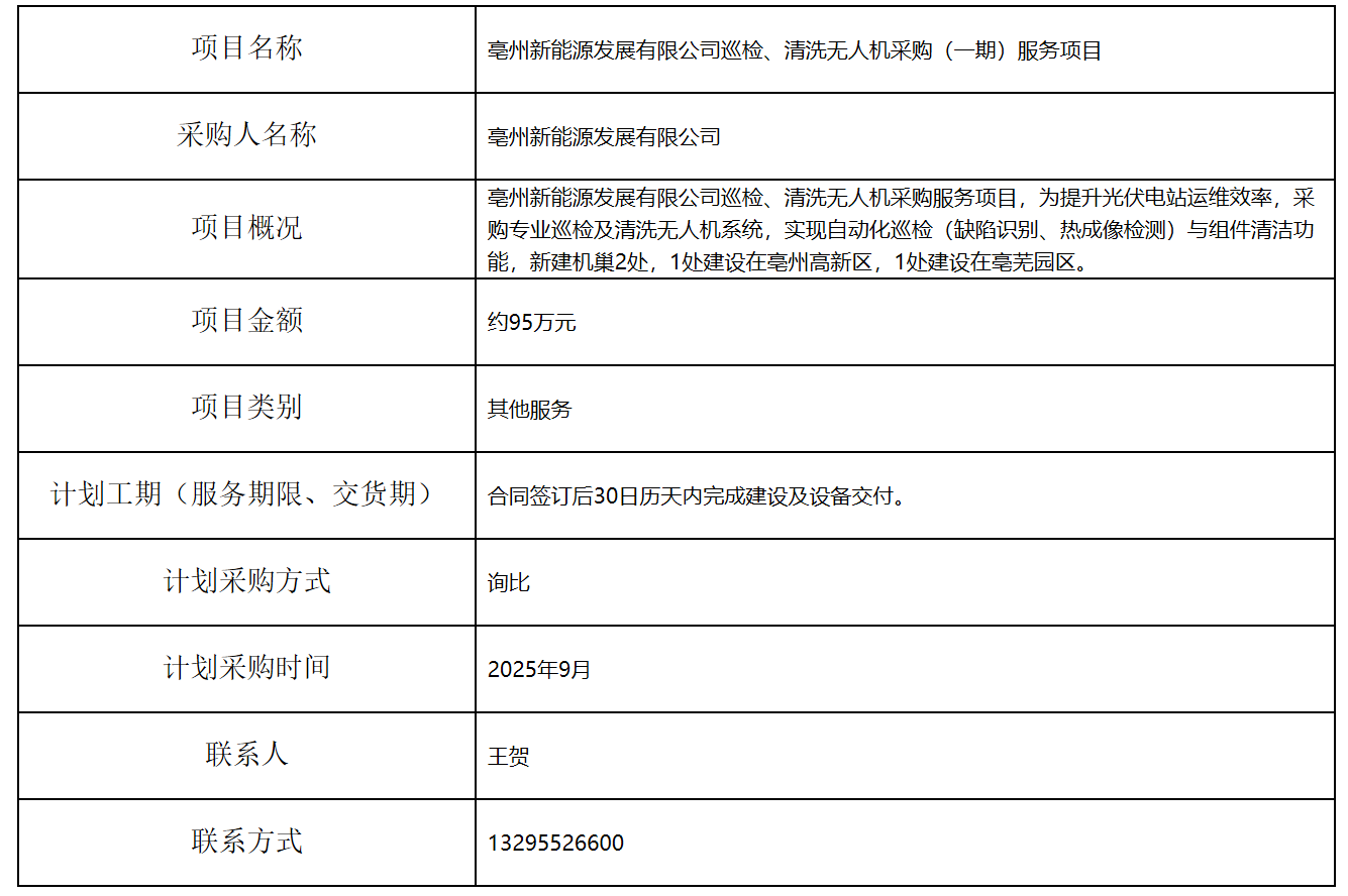 亳州新能源發(fā)展有限公司巡檢、清洗無人機采購(一期)服務(wù)項目招標計劃