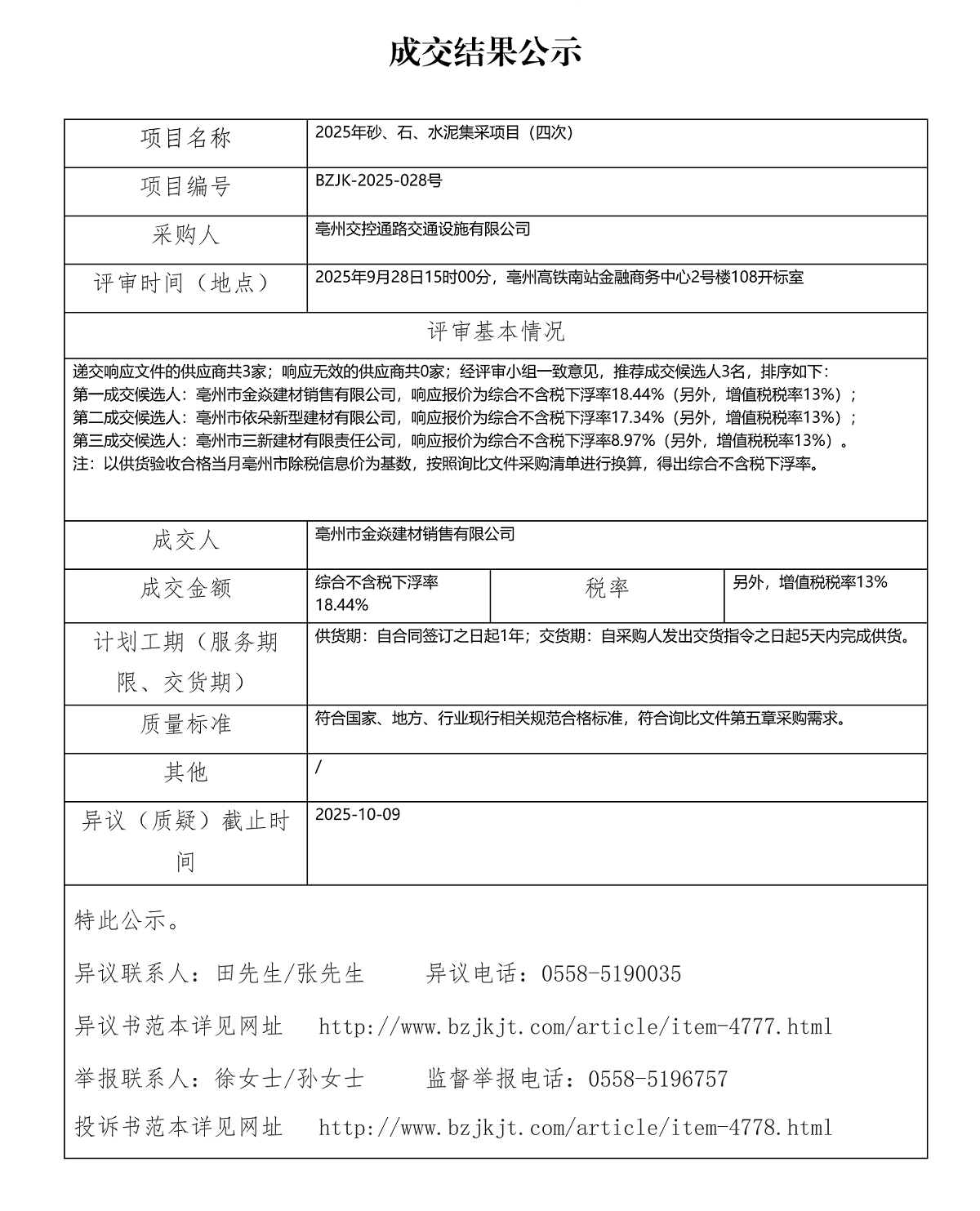 2025年砂、石、水泥集采項(xiàng)目(四次)成交結(jié)果公示