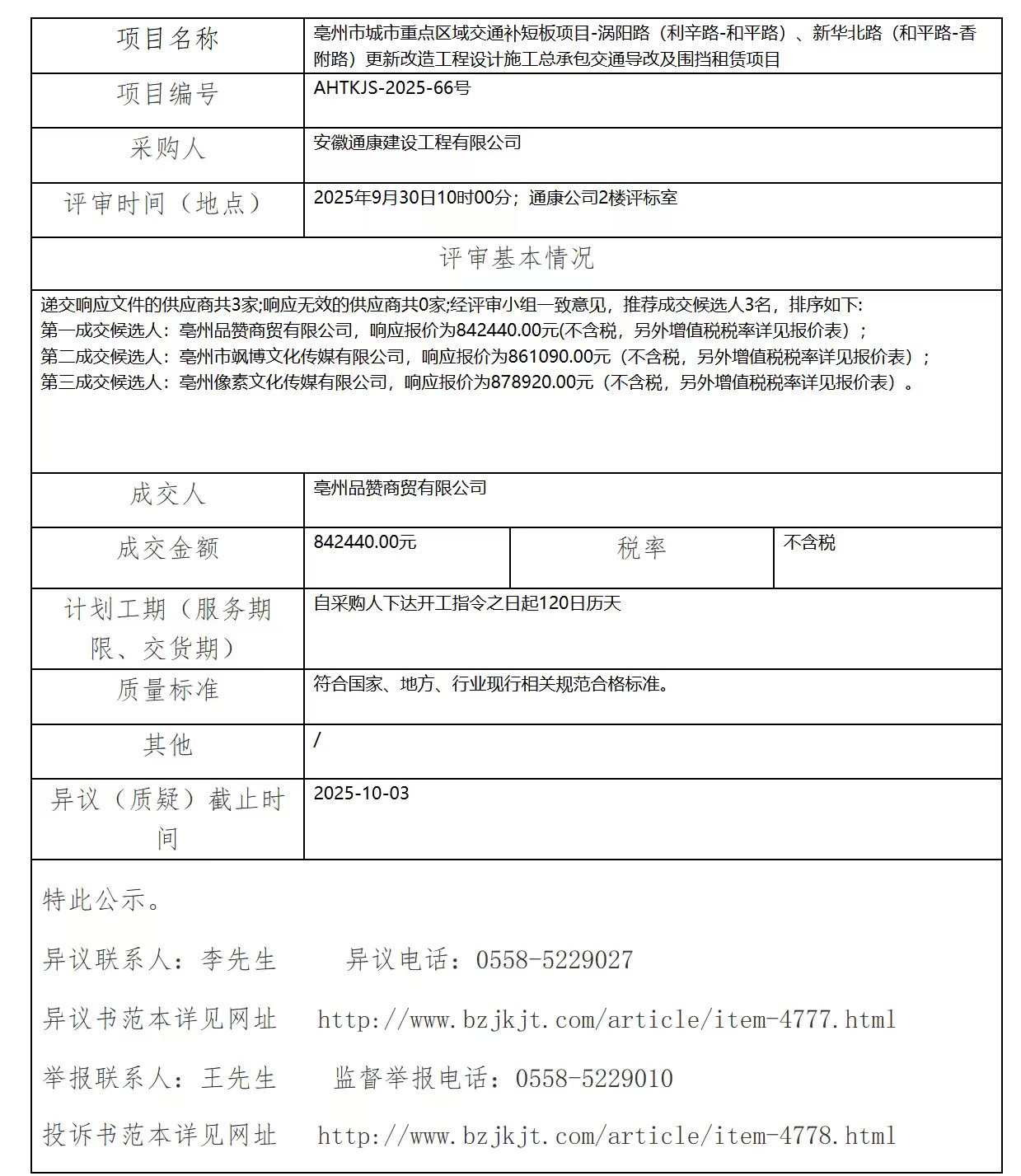 亳州市城市重點區(qū)域交通補短板項目-渦陽路(利辛路-和平路)、新華北路(和平路-香附路)更新改造工程設計施工總承包交通導改及圍擋租賃項目成交結果公示