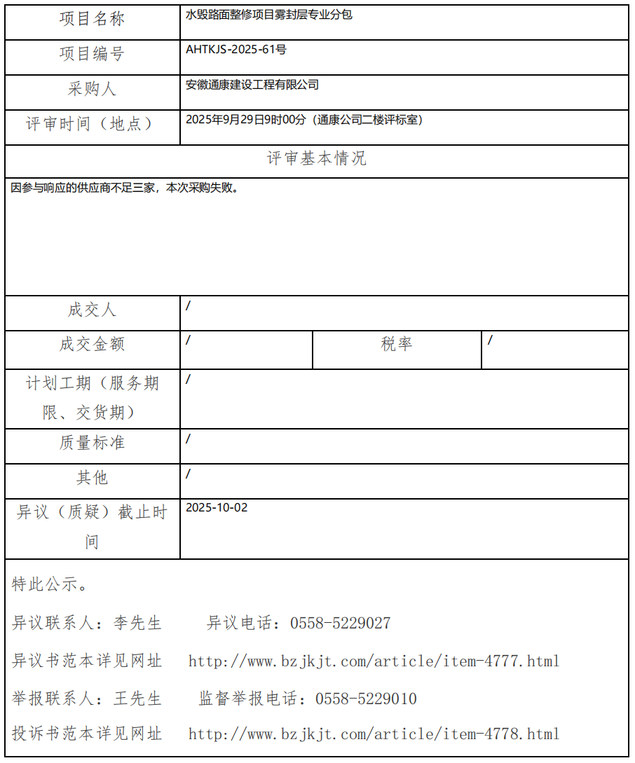 水毀路面整修項目霧封層專業(yè)分包成交結(jié)果公示