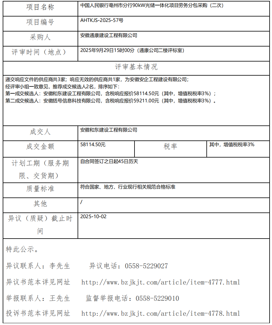 中國人民銀行亳州市分行90kW光儲一體化項目勞務(wù)分包采購(二次)成交結(jié)果公示