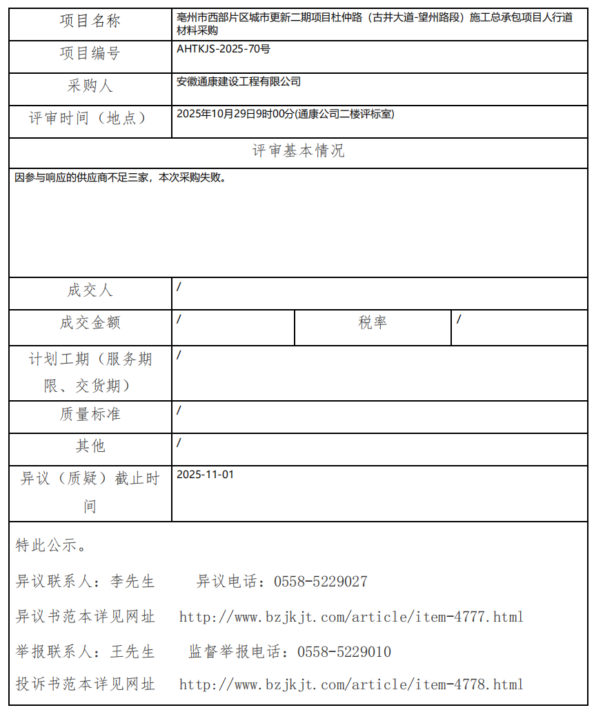 亳州市西部片區(qū)城市更新二期項(xiàng)目杜仲路(古井大道-望州路段)施工總承包項(xiàng)目人行道材料采購成交結(jié)果公示