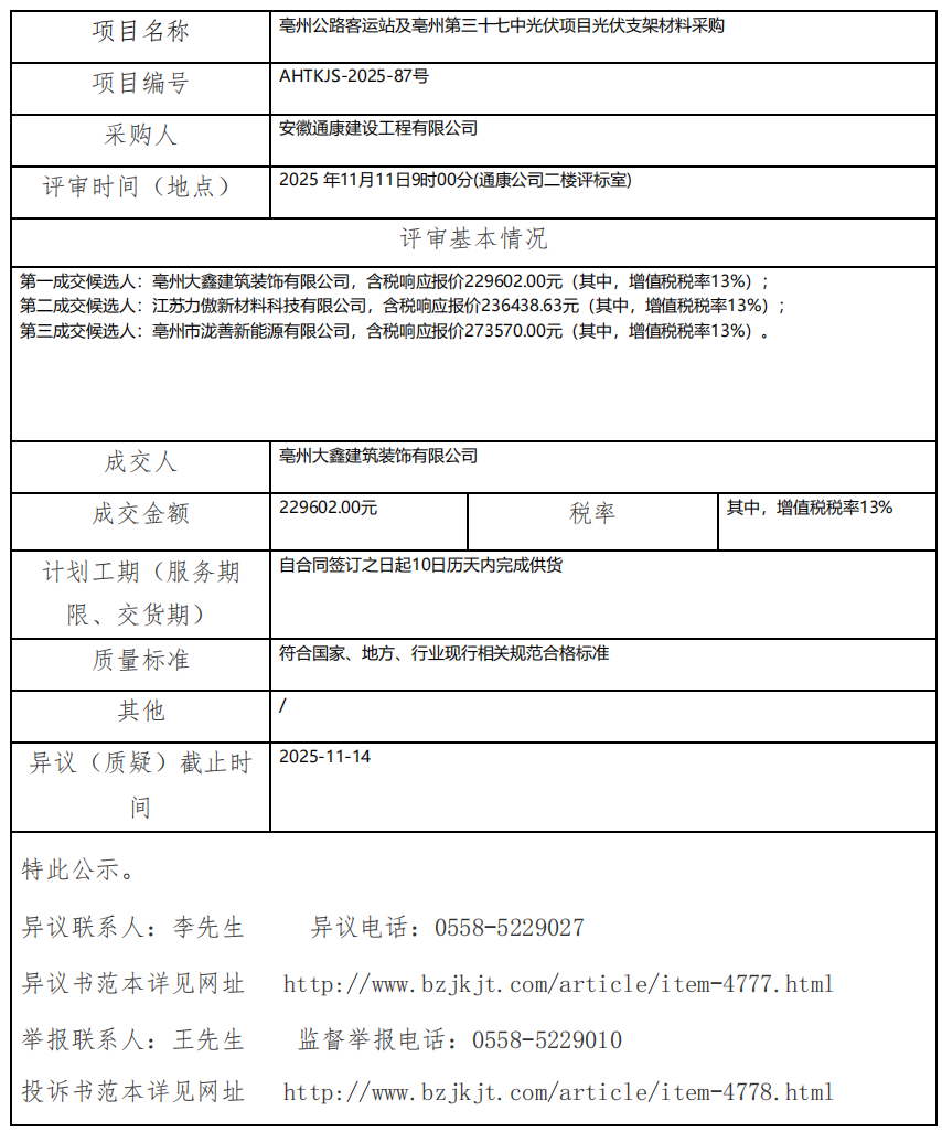 亳州公路客運站及亳州第三十七中光伏項目光伏支架材料采購成交結(jié)果公示