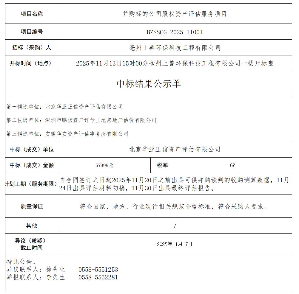 上善環(huán)??萍脊こ逃邢薰静①彉?biāo)的公司股權(quán)資產(chǎn)評(píng)估服務(wù)項(xiàng)目中標(biāo)結(jié)果公示