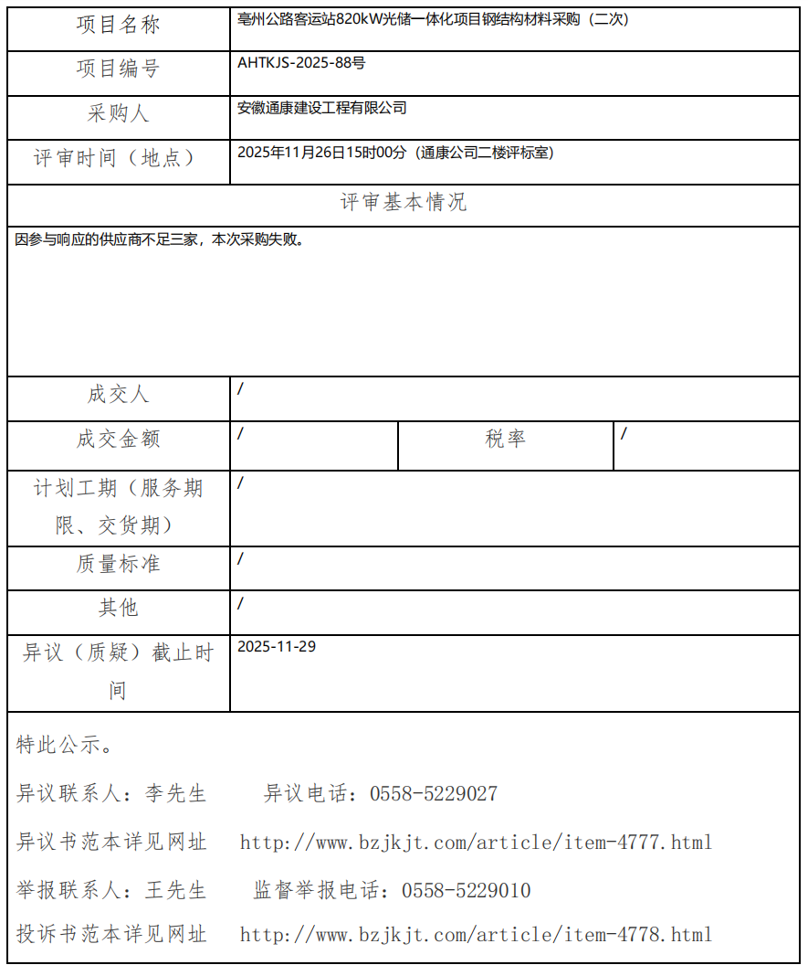 亳州公路客運(yùn)站820kW光儲(chǔ)一體化項(xiàng)目鋼結(jié)構(gòu)材料采購(gòu)(二次)成交結(jié)果公示