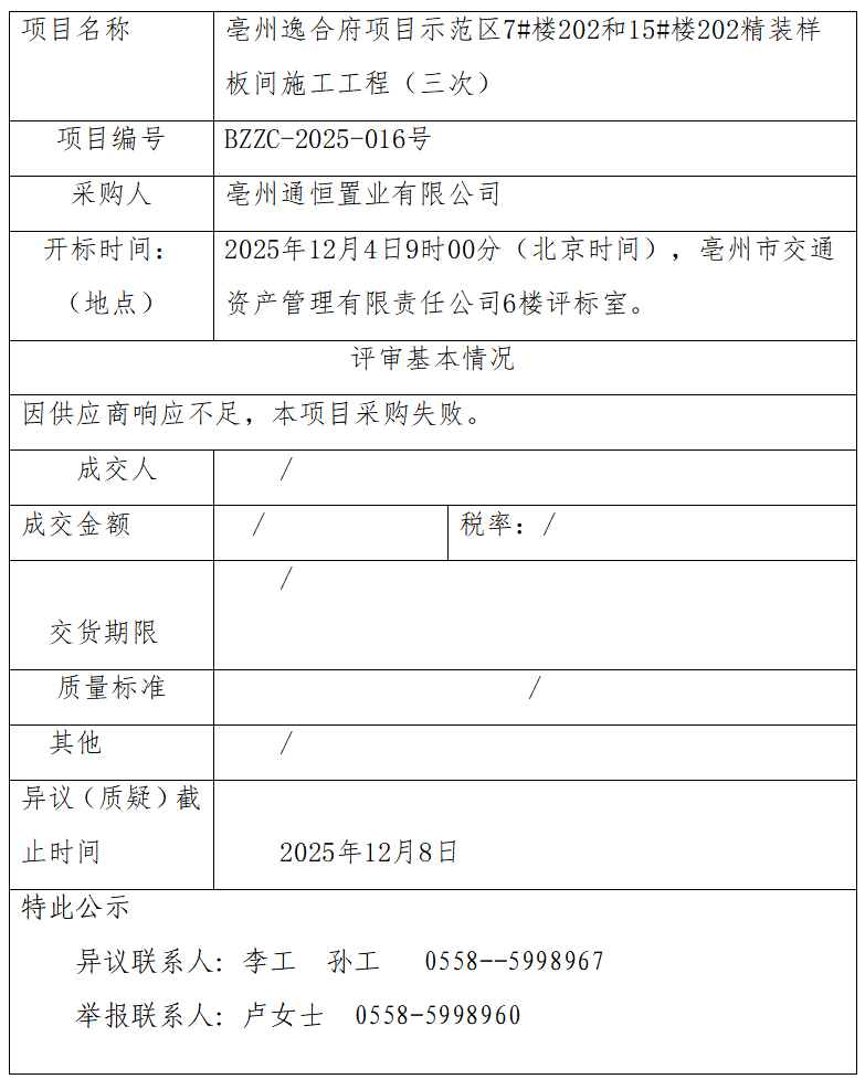 亳州逸合府項(xiàng)目示范區(qū)7#樓202和15#樓202精裝樣板間施工工程(三次)成交結(jié)果公示
