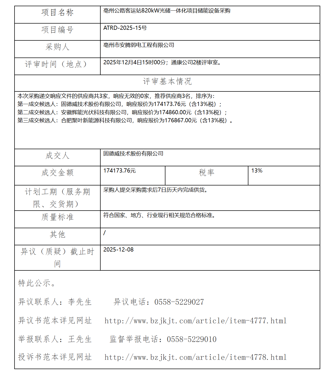 亳州公路客運(yùn)站820kW光儲(chǔ)一體化項(xiàng)目?jī)?chǔ)能設(shè)備采購成交結(jié)果公示